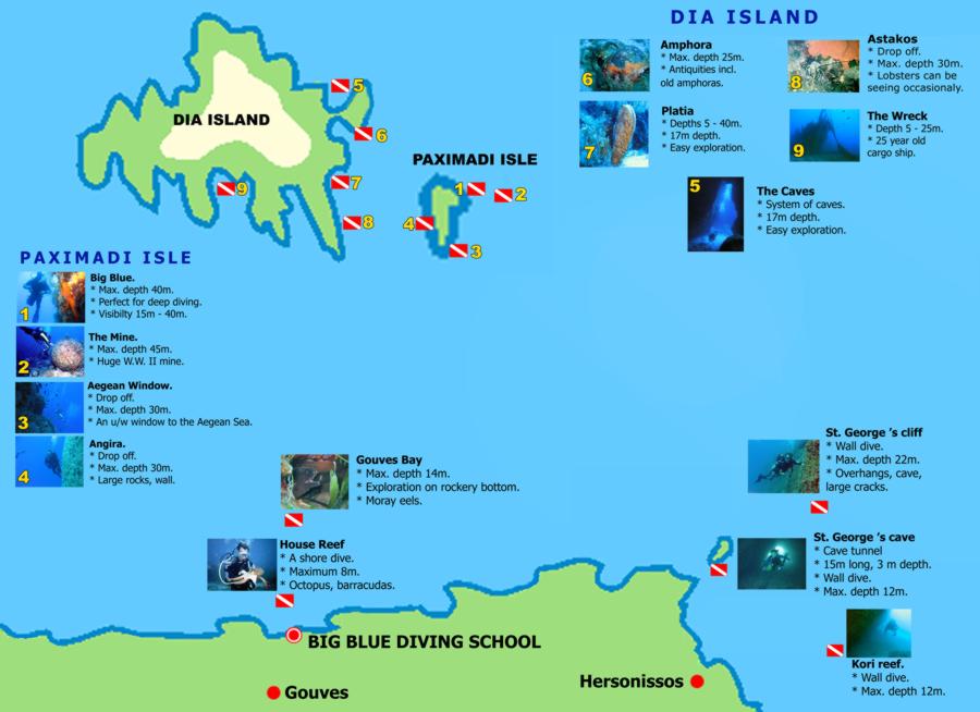 Die Tauchschule Big Blue befindet sich an der Strandbucht des beliebten Hotels Aphrodite 4* in Kato Gouves (ca. 18 km vom Flughafen Heraklion). Die routinierte Tauchschule unterhält einen gratis Transferbus für Gäste untergebracht in den Urlaubsorten Malia, Stalis, Hersonissos und Analipsis.